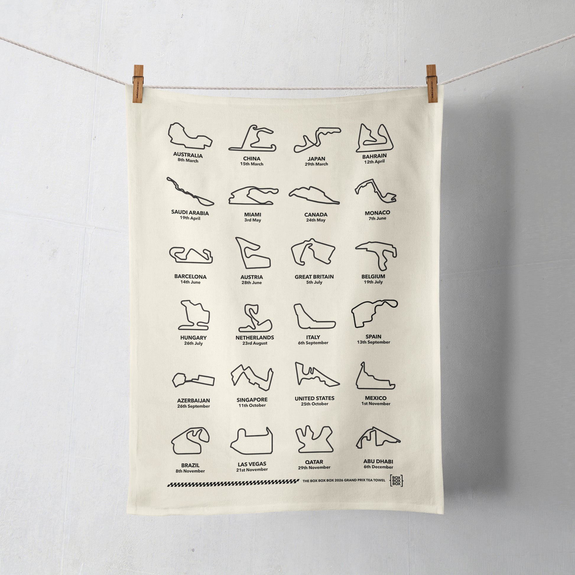 Our 2026 Grand Prix Tea Towel. Designed and made in the UK. Featuring all the tracks and dates for the 2026 season.